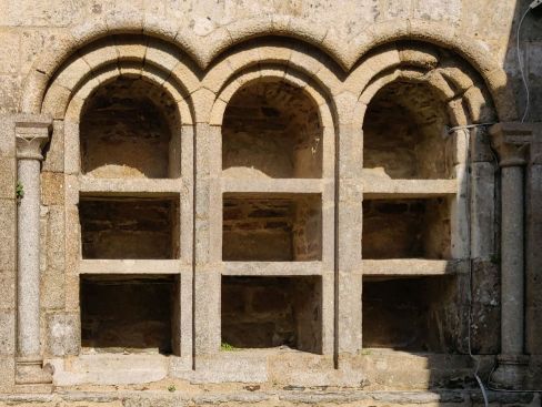 Voici, entre la porte de l'église et celle de la sacristie, dans le cloître, une série de niches pratiquées dans le mur du transept, encadrées par des colonnettes, couronnées par une moulure en bosse.